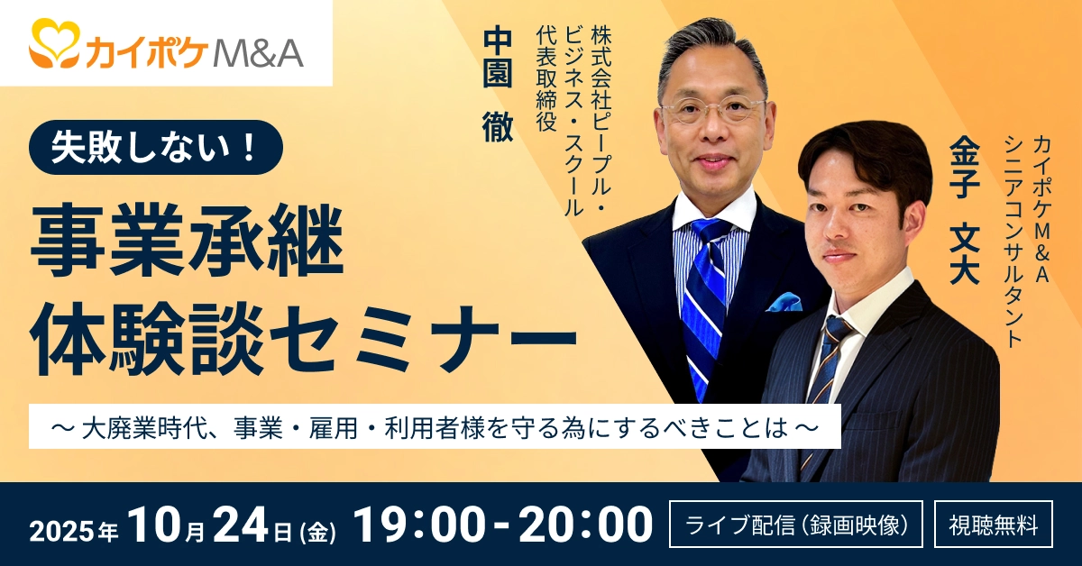 中園 徹 肩書:株式会社ピープル・ビジネス・スクール 代表取締役 <経歴> 大学卒業後アパレル会社勤務を経て、1994年に大阪市で接骨院を個人開業し、株式会社タオを設立。介護デイサービスを中心に事業を拡大し、従業員100名規模へと成長。経営環境の変化を機にM&Aによる事業承継を実施。現在は株式会社タオの共同代表を務めながら、これまでの経験を活かした株式会社ピープル・ビジネス・スクールを設立し、介護分野での人材採用・育成・定着に関する仕組みづくりの支援を行っている。 金子 文大 肩書:カイポケM&A シニアコンサルタント <経歴> 損害保険・生命保険の代理店支援に約4年間従事した後、株式会社エス・エム・エスに入社。 介護業界に特化したキャリアパートナーとして約6年間、数多くの企業の採用課題を支援する。 人材支援を通じて得た「より深く経営者に寄り添い、業界の発展に貢献したい」との想いからM&A支援グループへ異動し、現在はM&Aコンサルタントとして事業承継のサポートを手掛けている。 |